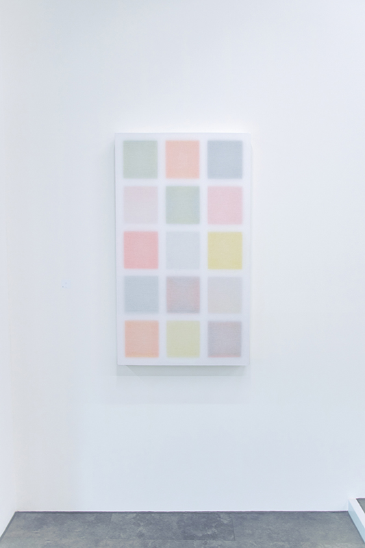 Untitled (15/3/2), Acrylic on wood, transparent trevira fabric, 115 x 65 x 9 cm, 2025, Installation view at Galerie Mathias Mayr (AT), 2025
