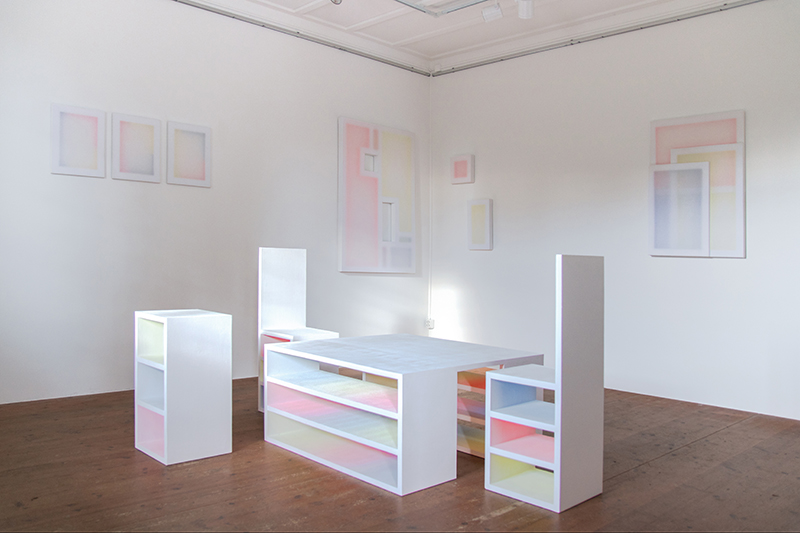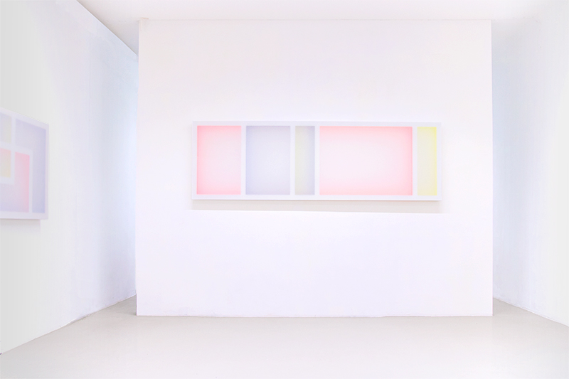 Untitled (C&P, C&P, C&P, C&P), Acrylic on wood, dyed transparent polyester fabrics, 90 x 160 x 9 cm each, at Kunsthalle Luzern, Lucerne (CH), 2022