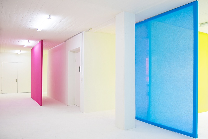 Untitled (C&P, C&P, C&P, C&P), Acrylic on wood, dyed transparent polyester fabrics, 90 x 160 x 9 cm each, at Kunsthalle Luzern, Lucerne (CH), 2022