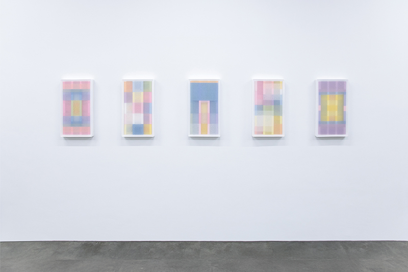 Untitled (VWS231017GUM), Acrylic on wood, transparent polyester fabrics, 160 x 90 x 9 cm each, 2024, Installation view at Die Mobiliar Art Collection, Bern (CH), 2024